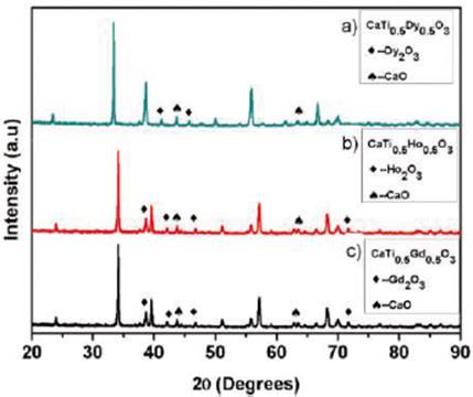 From the X-ray diffraction analysis shown in Figure 1, is clear that the CaTi05M05O3 system (M = Dy, Ho, Gd) is present in an orthorhombic structure with a spatial group Pbnm (62) which constitutes the main crystalline phase. The average grain size domains indicate values around 3.5x10-8 -3.7x10-8 m for the obtained materials, which were calculated using the Debye-Scherrer equation from the highest diffraction signals [6].