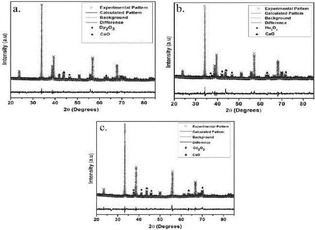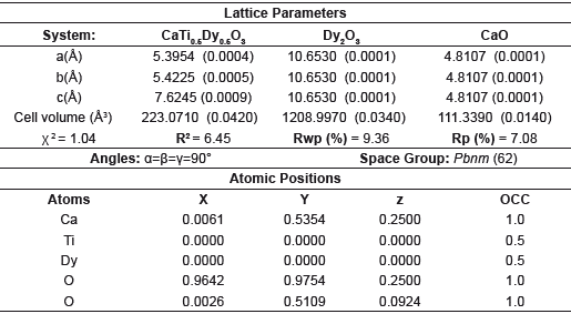 The analysis of the lattice parameters and crystalline phases based on the Rietveld refinement method shown in figure 2, show that the modification of CaTiO3 with Dy, Ho and Gd was effective and the presence of secondary phases is insignificant [7,8]. Two impurities were identified in each system, corresponding with rare earth oxides, which are identified with the (♦) and (♠) symbols for the CaO and RE2O3 respectively. In the case of CTDO system the solid shown an I a-3 (206) spatial group while in the CTHO and CTGO systems was clear a classification according with Fm-3m (225) spatial group respectively. These structures were indexed from corresponding crystallographic data and summarized in the Tables 1-3.