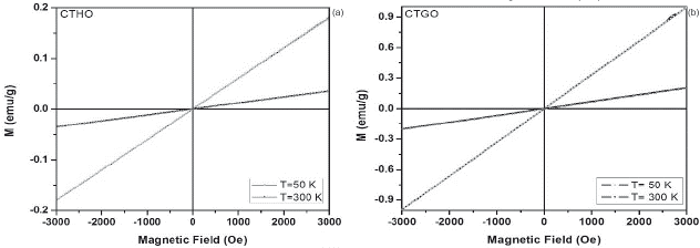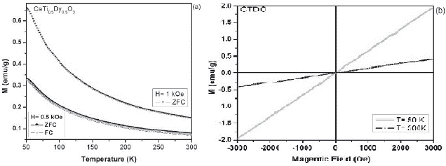 The magnetic characterization as a function of the temperature for all samples, suggest that the different modifications exhibit a paramagnetic behavior (M vs T), due to the presence of unpaired electrons in the 4fn orbital in Dy, Ho and Gd cations, whose electrons suffer an orientation process along magnetic field direction (a) (figures 3-5).Through the hysteresis curve (M vs H), this paramagnetic behavior is corroborated by a linear trend in figure (b).