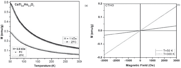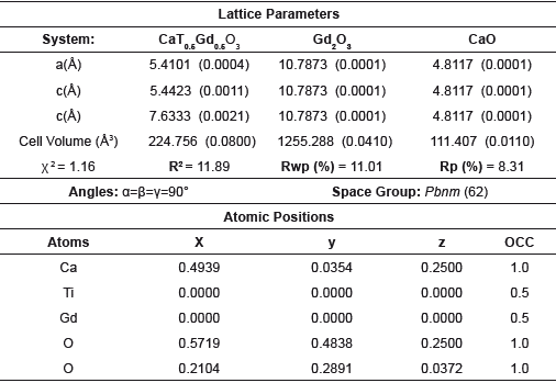 The synthesis of the CaTi0.5M0.5O3 (M = Dy, Ho, Gd) perovskite, starting from corresponding metal oxides of CaO, TiO2, Dy2O3, Ho2O3 and Gd2O3 99.9 % all from Sigma-Aldrich. In all cases, the solids were grounded in an agate mortar for 4 hours, to promote a high degree of homogenization. The solids were identified as follows: CaTi0.5Dy0.5O3 (CTDO), CaTi0.5Ho0.5O3 (CTHO) and CaTi0.5Gd0.5O3 (CTGO), which were pressed in a pellet form using hydrostatic press operated at 2.0 MPa. The pellets were treated at 1273.15 K for 24 hours and sintering at 1423.15 K for 24 hours respectively in air atmosphere. The structural parameters were evaluated by X-ray diffraction in a PANalytical X'Pert diffractometer with Cu K α radiation (λ = 1.54x10-10 m), between 20° to 90°. The analysis of the diffraction patterns were done through the Rietveld routine using the GSAS software. The magnetization measurements based on the applied magnetic field and temperature were carried out on a Versalab vibrating sample magnetometer (VSM), with temperatures between 50 K and 300 K and magnetic fields between -30 kOe and 30 kOe.