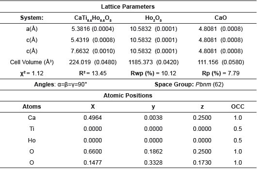 Abstract: In this work we studies and evaluates the structural and magnetic properties of CaTi1-xMxO3 system where M = Dy, Ho, and Gd, using a substitution level of x = 0.5, in order to improve the magnetic response of synthesized materials by the solid state reaction method. For each system stoichiometric quantities of TiO2, Ho2O3, Dy2O3, Gd2O3 and CaCO3 precursors were used, which were treated at 973,15 K for 2 hours and grounded to ensure the homogeneity of compositions. The structural characterization was initiated by a modelling process provided by the SPuDS software, which allowed to evaluate the critical tolerance values of the structures under temperature conditions. The X-ray diffraction analysis and Rietveld refinement using the GSAS and EXPGUI software, revealed that all samples exhibit an orthorhombic configuration with spatial group Pnma (62). The magnetic characterization evaluates the magnetic behavior of the systems according to the magnetization curves as a function of temperature and the hysteresis curves as a function of the external field that is applied to each of the proposed systems, resulting in a paramagnetic behavior. These results demonstrate that it is necessary to complement this information to provide more effective tools in the synthesis of these materials, when determining the effect of the mass transport properties, that could affect the distribution of cation B and thus to clarify the optimal structure (with possible vacancies Of oxygen), which would lead to the formation of complex extended defects in the solids.
