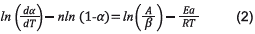 Donde A es el factor preexponencial o de frecuencia; Ea la energía de activación; R, la constante universal de los gases; T, la temperatura absoluta; f(α), la función cinética que representa el modelo cinético, y α, la conversión. Al aplicar la función logaritmo neperiano a la ecuación (1) y al asumir el modelo de reacción f(α)=(1- α)n, típicamente usado en este tipo de procesos y análisis [14], se obtiene lo siguiente: