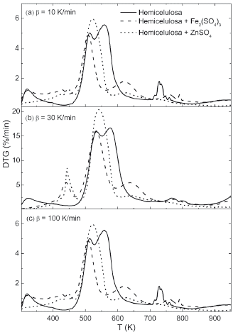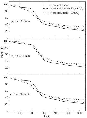 De acuerdo con los resultados mostrados en la Figura 2, a todas las velocidades de calentamiento los termogramas de la pirólisis de la hemicelulosa en presencia de sulfato férrico presentan tres picos claramente definidos, en contraste con los dos picos solapados que se observan en el termograma de la pirólisis de la hemicelulosa pura: un primer pico que se evidencia a velocidades de calentamiento de 30 y 100 K/min y que inicia alrededor de 413 K; un segundo evento con una velocidad máxima de descomposición y temperatura de pico similar al primer pico de la pirólisis de la hemicelulosa pura, el cual se observa para todas las velocidades de calentamiento; y un tercer pico que se desplaza a temperaturas más altas con respecto al segundo pico de la pirólisis de la hemicelulosa pura: para la velocidad de calentamiento 10 K/min este desplazamiento es de 40 K, y para las muestras que se calientan a 30 y 100 K/min es de 70 K. Por otra parte, el sulfato de zinc cambia considerablemente el perfil del termograma de la pirólisis de la hemicelulosa dentro del rango de temperatura de interés, mostrando un primer pico que inicia alrededor de 413 K, el cual contrasta con el primer pico que se presenta para la pirólisis de la hemicelulosa pura que inicia alrededor de 473 K; adicionalmente, se observa un segundo pico con una temperatura de máxima velocidad de descomposición, cuyo valor se encuentra entre las temperaturas de los dos picos que presentan las muestras de hemicelulosa pura. Este segundo pico de la pirólisis catalítica de la hemicelulosa con sulfato de zinc exhibe la mayor velocidad de descomposición entre todas las muestras a todas las velocidades de calentamiento usadas en este trabajo. El cambio de la forma de los perfiles ha sido reportado para la celulosa y otras sales usadas como catalizadores [26].