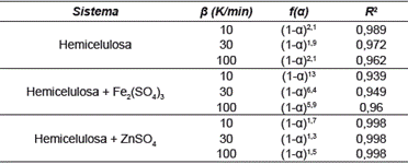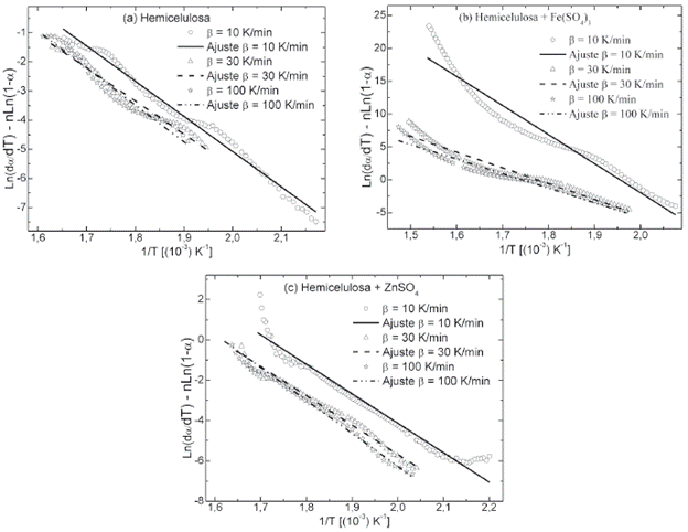 Modelo de orden de reacción n: A pesar de la aparente complejidad de los termogramas, los datos experimentales se ajustaron bien a este modelo (figura 3). Para el caso de la pirólisis de la hemicelulosa pura, se observó un orden de reacción 2, independientemente de la velocidad de calentamiento (tabla 2). La presencia del sulfato férrico como catalizador cambia significativamente el orden de reacción de la pirólisis de la hemicelulosa a valores altos, poco realistas desde el punto de vista cinético y que varían considerablemente con la velocidad de calentamiento. Por otra parte, el sulfato de zinc disminuye el orden de reacción de la pirólisis de la hemicelulosa a 1,5. Este valor es constante a todas las velocidades de calentamiento estudiadas. El valor promedio de la energía de activación de la pirólisis de hemicelulosa pura obtenido usando con este modelo es 100 ± 5 kJ/ mol, el cual está incluido en el rango de los valores reportados en la literatura (95-267 kJ/mol) [27-29]. Para el caso de la pirólisis de la hemicelulosa usando como catalizador el sulfato de zinc, el valor de la energía de activación obtenido es 127 ± 8 kJ/ mol. En términos generales, la aplicación de este modelo a los datos experimentales sugiere un cambio de mecanismo de reacción en presencia de los catalizadores estudiados. Resultados similares fueron obtenidos para la celulosa al agregar sales como el ZnCl2[26].