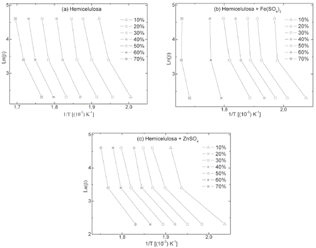 Modelo isoconversional: los resultados del ajuste de los datos experimentales de la pirólisis de la hemicelulosa en presencia y ausencia de los catalizadores estudiados se muestran en la figura 4. Este modelo presentó un buen ajuste para la pirólisis de la hemicelulosa pura, con valores de coeficiente de correlación superiores a 0,9. Sin embargo, el modelo no ajusta bien a la reacción de pirólisis de la hemicelulosa catalizada por los sulfatos de estudio. Esto es de esperarse debido a los múltiples picos y a la separación que entre estos se presenta en el rango de temperatura del evento de interés, cuando la pirólisis de la hemicelulosa ocurre en presencia de los sulfatos estudiados. El valor de la energía de activación para la pirólisis de la hemicelulosa pura obtenida con este modelo es 272 + 29 kJ/mol, el cual es consistente con los valores reportados en la literatura [27-29]. Si bien el valor de la energía de activación para la pirólisis de la hemicelulosa pura está incluido en el rango reportado en la literatura, difiere considerablemente del valor obtenido para la misma reacción con el modelo de orden de reacción n. En este caso, el amplio rango de valores para la energía de activación de la pirólisis de la hemicelulosa reportado en este estudio y en la literatura puede atribuirse también a la fuente de donde es extraída, la naturaleza compleja de la molécula y las suposiciones hechas en los modelos de ajuste cinético [30].