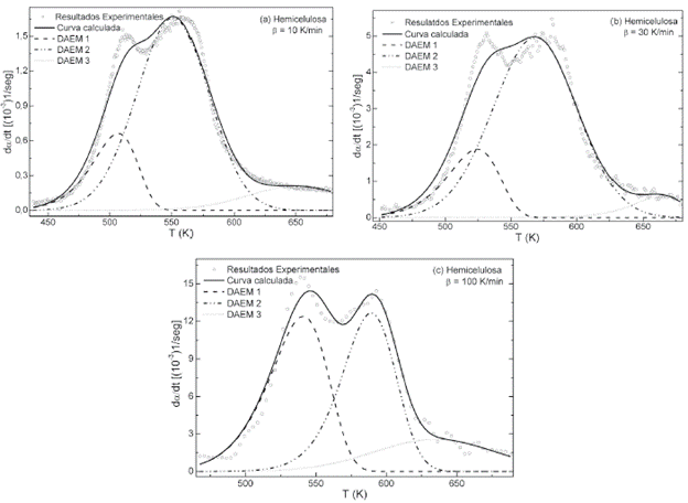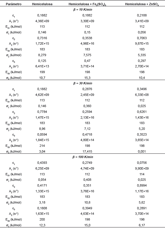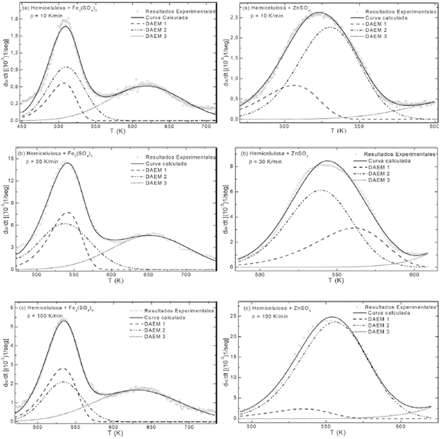 DAEM: El ajuste de los datos experimentales de la pirólisis de la hemicelulosa pura a velocidades de calentamiento 10, 30 y 100 K/min al modelo DAEM se muestra en la Figura 5 y los parámetros resultados del ajuste en la tabla 3. Fueron necesarios 3 conjuntos de reacciones DAEM para describir el comportamiento de la pirólisis de la hemicelulosa en ausencia y presencia de los catalizadores, como se muestra en las Figuras 5 y 6. Cuando se comparan con los parámetros de la pirólisis de la hemicelulosa pura, los resultados del ajuste a este modelo muestran cambios en los parámetros cinéticos del segundo y tercer conjunto de reacciones DAEM, tanto para la pirólisis de la hemicelulosa catalizada con sulfato férrico como para la reacción catalizada por sulfato de zinc.
