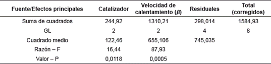 La influencia que tienen los catalizadores sobre la reacción de pirólisis de la hemicelulosa se confirmó a través del análisis de varianza (ANOVA) del diseño experimental. Se tomaron como variables manipuladas el tipo de catalizador y la velocidad de calentamiento, y como variable de respuesta la temperatura de pico del primer pico dentro del rango de temperatura de pirólisis de las muestras. El ANOVA mostró que las dos variables manipuladas tienen un efecto significativo sobre la temperatura de pico, con un nivel de confianza del 95 % (véase tabla 1). Se encontraron resultados similares con otras sales inorgánicas a concentraciones tan bajas como 0,01 % en peso, para otro de los componentes de la biomasa, la celulosa [26]. Al ser el xilano y la celulosa ambos polímeros de azúcares, los efectos significativos de las sales agregadas en el estudio sobre los parámetros de pirólisis no resultan sorprendentes.
