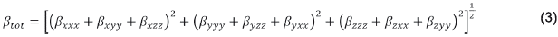 En el caso de la primera hiperpolarizabilidad β, se (1) define un vector β (βv), donde cada componente de este vector se calcula como β i=β iii+β ijj+β ikk , ∀ i,j,k ={x,y,z}. En consecuencia, el βtot, o módulo βv, es: