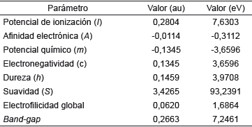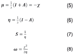 Por otro lado, propiedades como el potencial químico (μ) y la dureza (η) son expresadas sobre las bases de la aproximación de diferencias Anitas en términos de I y A [18]. La suavidad (S) es un parámetro recíproco de la dureza, (X) corresponde a la electronegatividad (ω), equivale al índice de electrofilicidad; dichos parámetros se expresan en las siguientes ecuaciones: