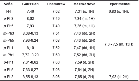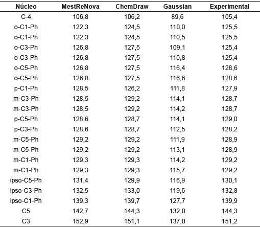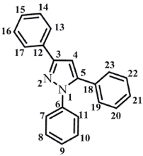 Los desplazamientos químicos teóricos de RMN 1H de y RMN 13C de 1,3,5-trifenilpirazol junto con los valores experimentales se presentan en las tablas 5 y 6 [32].