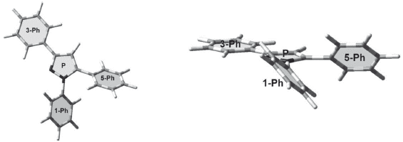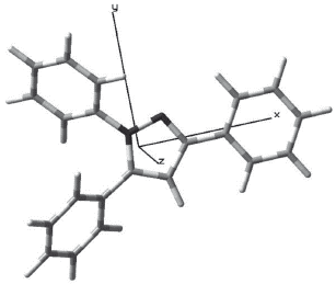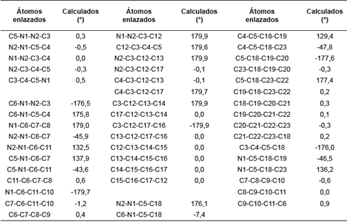 Los valores de los ángulos diedros del pirazol cercanos a cero grados demuestran la planaridad del anillo. Este comportamiento también lo presentan internamente los fenilos que sustituyen el pirazol. La disposición espacial de los fenilos con respecto al pirazol no es coplanar para los 1-Ph (C5-N1-C6-C7= 137,8° y 5-Ph (C4-C5-C18-C19=129,4°. Sólo el 3-Ph (N2-C3-C12-C13= 179,9° presenta coplanaridad con el pirazol (ver figura 2).