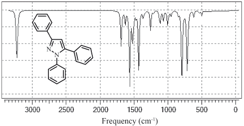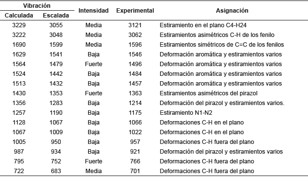 El espectro de IR se presenta en la figura 3. Las vibraciones de C-H para benceno se observan normalmente en el rango de 3000 a 3100 cm-1 [29] con una intensidad media. Las vibraciones calculadas que se muestran en la tabla 4 se correlacionaron bien con los datos experimentales (r2=0,9985). Los estiramientos C=C del benceno generalmente aparecen entre 1400 a 1600 cm-1 [30,31]. En la Tabla 4 se observa que todos los estiramientos experimentales y calculados presentan buena correlación y se encuentran en la región esperada, a excepción de las frecuencias 1363 (1353), 1214 (1283) y 1175 (1190) y 921 (934) que no corresponden a estiramientos en los fenilos y que se atribuyen a las deformaciones y estiramientos del núcleo de pirazol.