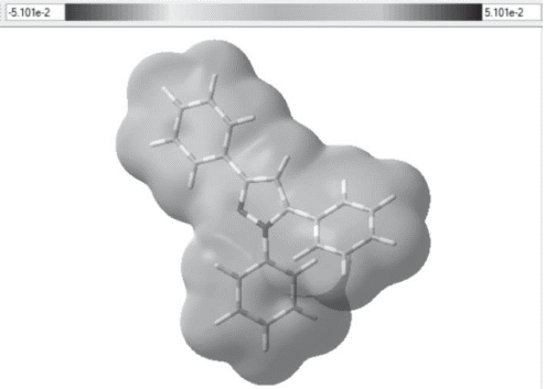 En la figura 4 se ilustran los sitios reactivos de la molécula sobre el anillo 3-Ph y los nitrógenos del pirazol con distribución de carga con los valores de potencial de -5.101 x 10-2 a 5.101 x 10-2. En el resto de la molécula se muestra un color gris tenue que indica que la distribución de electrones en esta zona es neutra o intermedia, es decir, que existe un balance de la densidad electrónica, el cual se da por la presencia de enlaces.