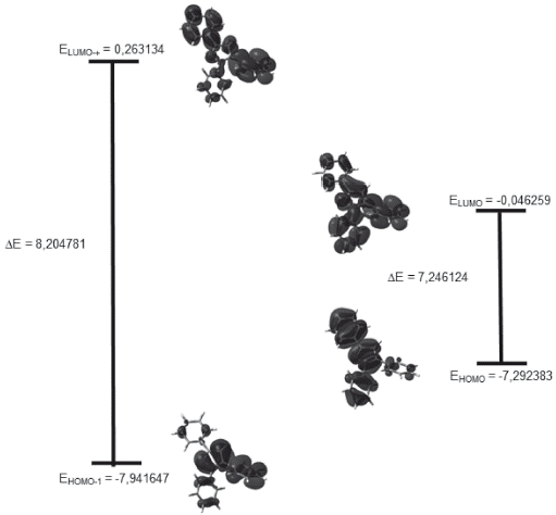 Un band-gap de 7,246124 eV indica claramente que la molécula es muy estable, es decir, la transferencia de la carga está ocurriendo dentro de la molécula mediante el sistema espaciador. El compuesto en estudio no sería un buen candidato para ser utilizado como semiconductor, debido a este alto valor y posiblemente actuaria mejor como resistor 10]. En general los materiales semiconductores orgánicos incluyen hidrocarburos aromáticos policíclicos (HAP) donde las propiedades conductoras dependen de la brecha energética y está establecido que la energía de banda de separación de los aislantes es grande (> 4 eV), pero inferior para semiconductores (< 3 eV) [11]. En el diagrama también se muestra el band-gap entre los orbitales HOMO-1 y LUMO+1 de 8,204781 eV, lo cual indica para que se lleve a cabo una transición de electrones necesitaría mucha energía, al tener este un valor mayor que el bang-gap de los orbitales HOMO-LUMO.