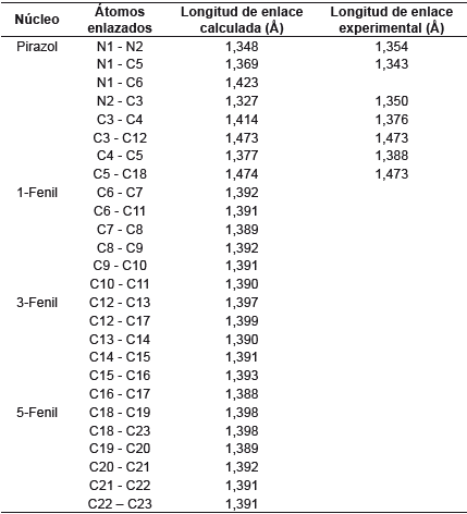 Se conoce que las longitudes de enlace C-C y C-H en el benceno son 1,40 y 1,08, respectivamente [28]. Tomando estos valores como referencia se observa en la tabla 1 que los tres fenilos sustituyentes conservan sus distancias de enlace sin verse modificadas por el anillo de pirazol. Asimismo, se esperaría una modificación en los enlaces de los fenilos sustituyentes en las posiciones 1 y 5 del pirazol, debido a su gran cercanía, pero esto no se presenta, ya que la molécula, al adquirir su geometría de mínima energía, mantiene los parámetros de las longitudes de enlaces.