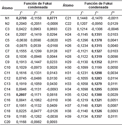 La función de Fukui se interpreta como el cambio de potencial químico dada una perturbación externa o la variación de la densidad electrónica, y se da al cambiar su número de electrones, ya que cuando el sistema en estudio recibe o cede electrones se define la capacidad electrofílica o nucleofílica de la especie química. La función de Fukui refleja entonces la reactividad de diferentes sitios dentro de una molécula, es decir, la selectividad, en donde la dirección de ataque preferida por un reactivo será aquella donde la función de Fukui presente los valores más altos (19). Por otro lado, la suavidad local se conoce como un indicador para las secuencias de reactividad intermolecular, dado que la suavidad local es una cantidad producto de un descriptor de reactividad global [19].