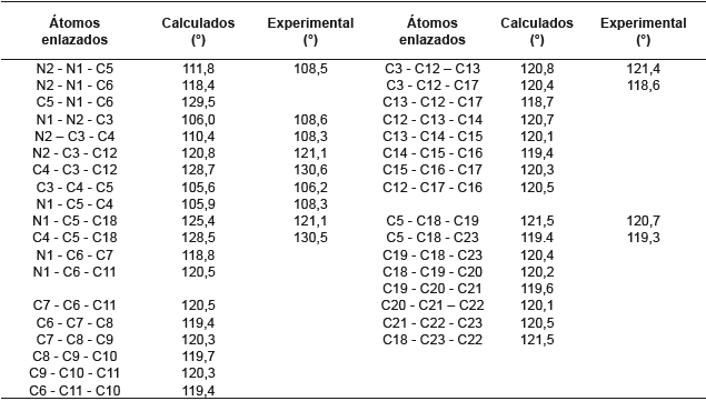 El anillo de pirazol debería ser un pentágono regular con ángulos de 108°, pero debido a la presencia de los dos nitrógenos esta geometría se modifica muy levemente en el ángulo C3-C4-C5 y toma un valor de 106,2°, que es menor al esperado. Comparando los valores experimentales con los calculados se observa que estos últimos presentan mayor distorsión de un pentágono regular, pero aún son muy cercanos. Con respecto a los ángulos de los fenilos sustituyentes y su relación con el anillo de pirazol se observan valores muy cercanos a los esperados de 120° para un hexágono regular. Esto se respalda con los valores experimentales que son muy cercanos a los calculados.