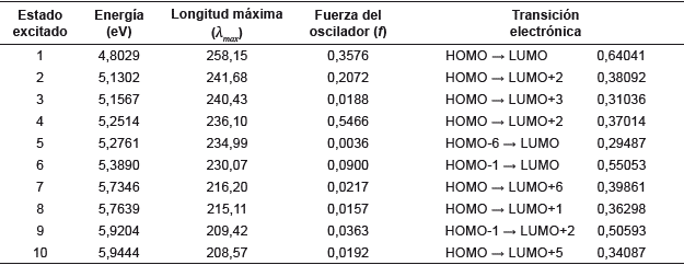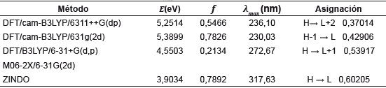 La naturaleza de las transiciones electrónicas, la energía de las transiciones (E), las longitudes de onda de máxima absorción (λ max) y la fuerza oscilatoria (f) para los estados excitados de la molécula fueron calculadas por varios métodos.