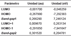 El mapa de potencial electrostático (MEP) es un método de cartografía del potencial electrostático, es decir, muestra la distribución de carga del sistema. Con esta superficie es posible determinar la forma, el tamaño y la orientación del momento dipolar de la molécula, representando un método visual para comprender la polaridad relativa [10-12]. Adicionalmente, es posible dilucidar cómo las moléculas interactúan entre sí. Los orbitales de frontera, HOMO y LUMO, según la teoría de Fukui, determinan la reactividad de una molécula frente a otra especie [13]. Los orbitales HOMO-1 y LUMO+1 se denominan donante y aceptor, son niveles de energía que se encuentran por debajo y por encima de los niveles principales, respectivamente [14].
