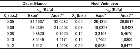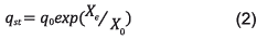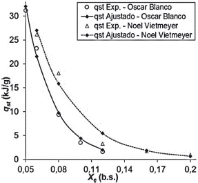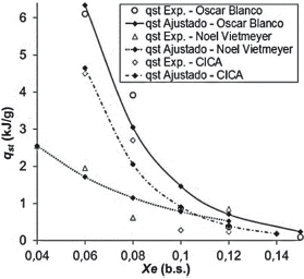 Donde: q st , es el calor isostérico de adsorción neto, cuando el contenido de humedad es constante; X e, es la humedad de equilibrio (g de agua/g muestra seca); q 0 , es el calor isostérico de adsorción (kJ/ mol) de la primera molécula de agua en el alimento y se define cuando X e → 0 => q st → q 0 , y X 0 es el contenido de humedad característico para cada producto.