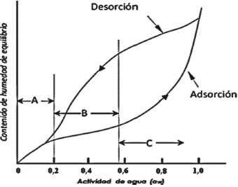 Las isotermas de los alimentos, se dividen en tres regiones (Figura 1) denotadas por A, B y C. En la región A, las moléculas de agua están enérgicamente ligadas a los sitios específicos en el sólido, estos sitios contienen a los grupos hidroxil de los polisacaridos, carbonil y amino de las proteínas, uniéndose a través de puentes de hidrogeno y fuerzas ión-dipolo. Es así que esta agua no está disponible como solvente y por lo tanto no colabora microbiológicamente, enzimáticamente o químicamente. A esta zona se la denomina monocapa [9]. En la región B el agua se encuentra en multicapas [4], menos fuertemente unida, estando presente normalmente en pequeños capilares [10] y en la región C se presenta estructuralmente y puede presentar soluciones [4], suelta en grandes capilares o está libre [10].