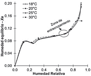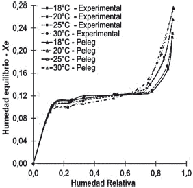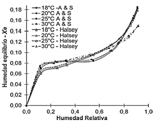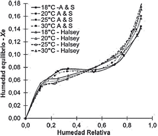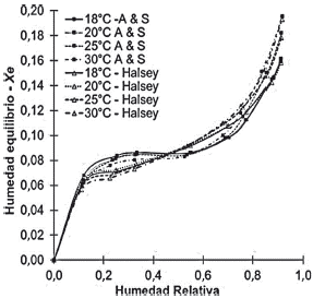 Las isotermas de adsorción se evaluaron a las temperaturas de 18°C, 20°C, 25°C y 30°C, a fin de determinar la humedad de equilibrio (X e) para los granos de kiwicha.