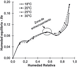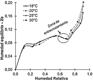 El efecto de la influencia de la temperatura en el comportamiento higroscópico de los cereales estudiados, se manifiesta antes y después de la zona de entrecruzamiento, ocurriendo la reversión de la tendencia de las curvas, es decir X e es menor antes del entrecruzamiento y se incrementa pasado este zona, y con el aumento de la temperatura, lo que indica que cualquier cambio de temperatura influenciará significativamente (p-value < 0,05) en la humedad de equilibrio de los granos de kiwicha de las variedades Noel Vietmeyer y CICA, aunque este hecho no es significativo (p-value > 0,05) para la variedad Oscar Blanco, esto debido al alto contenido de fibra, en comparación a las otras variedades.
