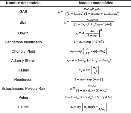 Se han clasificado 77 modelos de isotermas considerando aspectos teóricos, semiempíricos y empíricos [35], aplicados para productos agrícolas y alimentos procesados [36], algunas de ellas basadas en el comportamiento termodinámico del sistema alimento-agua como BET y GAB [33], mientras que las empíricas y/o semi-empíricas, que se han propuesto para correlacionar el contenido de humedad de equilibrio con la actividad de agua de un alimento [34], el modelo de Oswin (Tabla 1) representa una expansión en serie para curvas en forma sigmoidea, propuesta para relacionar la humedad de diversos alimentos con actividad de agua alrededor de 0.5 [37], la ecuación semiempírica de Henderson es adecuada para alimentos con alto contenido de almidón [38], el modelo de Caurie principalmente utilizado para alimentos deshidratados, presenta el parámetro X s (contenido de humedad de seguridad) que indica el contenido de humedad al cual se lograría la máxima estabilidad del alimento durante su almacenamiento [39], en tanto la ecuación de Halsey permite explicar la condensación de las multicapas de agua principalmente en almidones [39,40], el modelo semiempirico de Chung y Pfost aprobado por la Sociedad Americana de Ingenieros Agrícolas (ASAE) es recomendado generalmente para cereales y sus productos [42,43], mientras que los modelos de Peleg y Adam y Shove son una aproximación empírica [41], encontrando utilidad por el rango de utilización de a w entre 0.0 a 1.0 [50].
