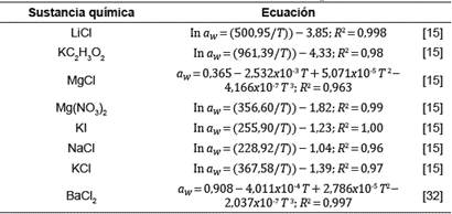 La construcción de las isotermas de adsorción, se basó en el método estático gravimétrico o método de control continuo de cambios de peso, descrito por [15. Se prepararon soluciones saturadas de acuerdo a las sustancias químicas, que se presentan en la Tabla 2, cada una presenta una HRE o a w a la temperatura deseada.