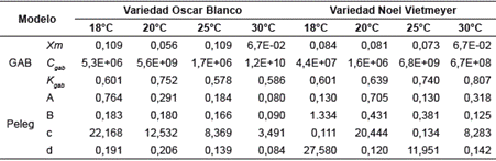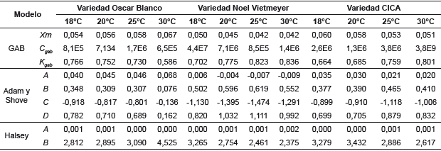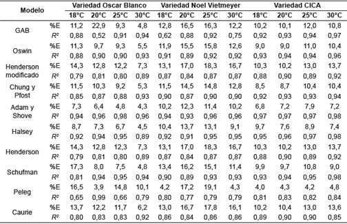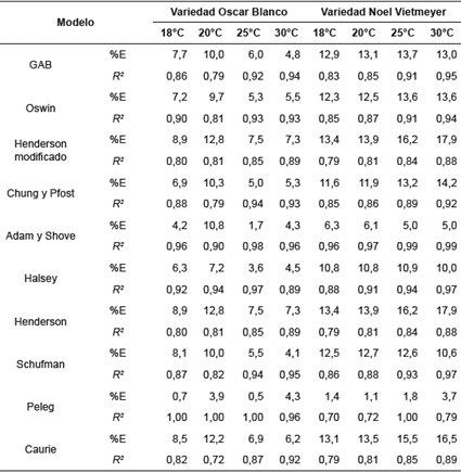 Al evaluar los modelos propuestos, se observó que el modelo de Adam y Shove se ajustó adecuadamente con %E < 7,3 y R2 >0,94 para la variedad Oscar Blanco, %E < 12,3 y R2 > 0,93 para Noel Vietmeyer, y para la variedad CICA %E < 7,9 y R2 > 0,97, asimismo el modelo de Halsey presentó buen ajuste con valores de %E < 8,7 y R2 >0,89 para la variedad Oscar Blanco, %E < 13,7 y R2 > 0,91 para Noel Vietmeyer, y para la variedad CICA %E < 9,7 y R2 > 0,95 (Tabla 3), es así que estos dos modelos permitirían describir adecuadamente el comportamiento higroscópico de la kiwicha a las temperaturas de estudio, no obstante los otros modelos presentaron valores de R2 y %E alentadores y aceptables pues en la mayoría de los casos presentan R2 > 0,7.