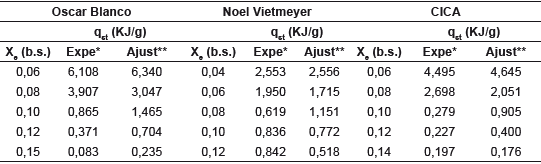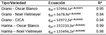 Para el cálculo del calor isostérico de sorción, q st, de los granos kiwicha, se consideraron los valores de X e especificados en las Tablas 7 y 8 a las temperaturas de evaluación, X e fue determinado con el modelo de Adam y Shove para los granos de kiwicha mientras que para sus harinas se utilizó el modelo Peleg.