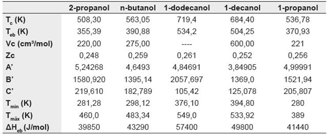 Para os álcoois em que os valores não estão disponíveis utilizou-se da lei dos estados correspondentes considerando Zc com valor padrão de 0,27, para assim se obter volume crítico (Vc) de cada substância. A equação de Riedel foi usada para obtenção da entalpia de ebulição do álcool.