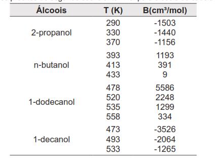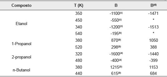 O cálculo da estimativa do segundo coeficiente (B) da equação virial foi aplicado para os álcoois:1 e 2-propanol, etanol, n-butanol, 1-decanol e 1-dodecanol, utilizando as informações apresentadas na literatura:10