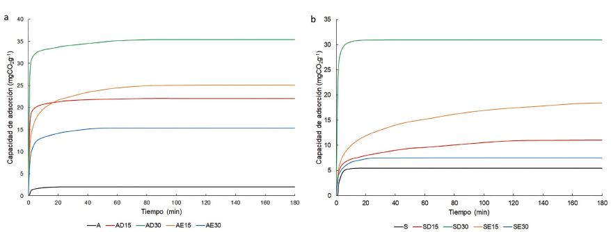 A pesar de que el área superficial se redujo después de la modificación, la presencia de aminas en los materiales base generó un aumento en la adsorción de CO2; esta interacción se atribuye a la formación de carbamatos de amonio en la superficie 31, aunque para los adsorbentes AE30 y SE30, una carga de amina del 30 % parece excesiva y pudo tapar poros internos, reduciendo el área superficial y el efecto de la amina en la adsorción. Esto no ocurrió con las muestras AD30 y SD30, ya que la reducción del espacio poroso se compensa con una alta interacción de la dietanolamina con CO2 al tener tres núcleos activos, específicamente dos grupos hidroxilo y un grupo amino.