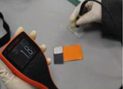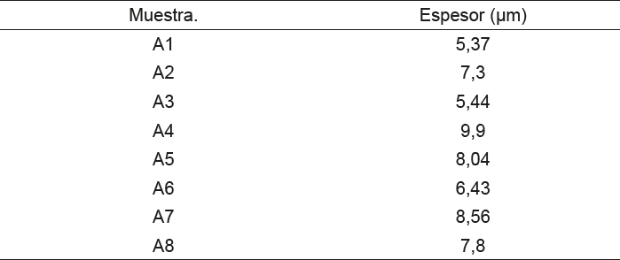 Medición de espesor por ultrasonido. Para lograr determinar el espesor de los recubrimientos obtenidos se hizo uso de un equipo de ultrasonido Elcometer con transductor acoplado (figura 10). La medición de espesores se realizó en 9 puntos diferentes de la muestra y se obtuvo el promedio de estas mediciones. Los resultados obtenidos en algunos de los recubrimientos depositados se pueden ver en la tabla 2.