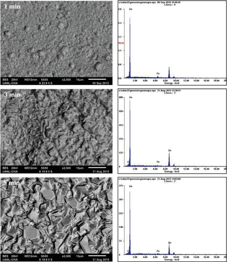 En la figura 11 se presentan las imágenes superficiales de los recubrimientos electrozincados obtenidos a tiempos de 1, 3 y 5 minutos de deposición y con densidad de corriente de 9 A/dm2 . Se observa que el tamaño de grano aumenta conforme se incrementa el tiempo de deposición; los granos son homogéneos en los tres tiempos utilizados, para los tiempos de 3 y 5 min se observan granos hexagonales de tamaños diversos y se presentó crecimiento aleatorio en todos los tiempos de electrodeposición. Para los tiempos de 3 y 5 min se observan claramente los límites de los granos, observación que no ocurre para el tiempo de 1 min. Los análisis EDS de las superficies para las muestras correspondientes a 3 y 5 min muestran zinc en su totalidad, mientras que la muestra de 1 min muestra presenta hierro.