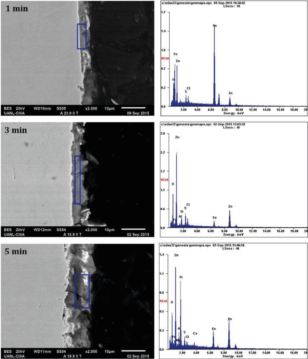 En la figura 12, se muestran las imágenes transversales de los recubrimientos electrozincados realizados a tiempos de 1, 3 y 5 min con densidad de corriente de 9 A/dm2 . Se observa que todos los recubrimientos depositados bajo estas condiciones presentaron agrietamientos que llegaban hasta el sustrato metálico. Se aprecia también un incremento del espesor del recubrimiento en función del tiempo de deposición. Los análisis EDS de la sección transversal muestran la presencia de Zn, Cl, S y O. Adicionalmente se notó la presencia de Si y Al probablemente provenientes de los aditivos utilizados durante la preparación metalográfica.