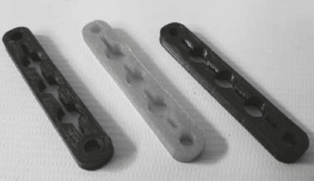 Para el diseño de la tapa soporte, figura 3, se hizo con base a los porta electrodos (porta ánodos y porta cátodo), además, de permitir ajustar la distancia entre ánodo y cátodo, dando así mayor versatilidad en las posibles experimentaciones. En la figura 4 se puede observar el proceso de obtención de los porta electrodos (porta ánodo y cátodo) en el material ABS, mediante la tecnología de modelado en un proceso de impresión 3D. El conjunto de la cuba, la tapa soporte y los porta electrodos (porta ánodos y porta cátodo) se muestran en la figura 4, estos últimos posicionados de tal forma que el sustrato (material a recubrir) este en el centro de la celda y los ánodos a los extremos de la celda.