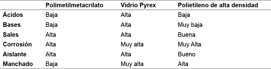 Para el recipiente contenedor de los electrolitos (cuba) se seleccionó el vidrio refractario tipo Pyrex según tabla 1; además, se utilizó el ABS (Acrylonitrile Butadiene Styrene) para la cubierta con el objeto de poder imprimir el modelo con tecnologías modernas de impresión en 3D, según los requerimientos de diseño [3].