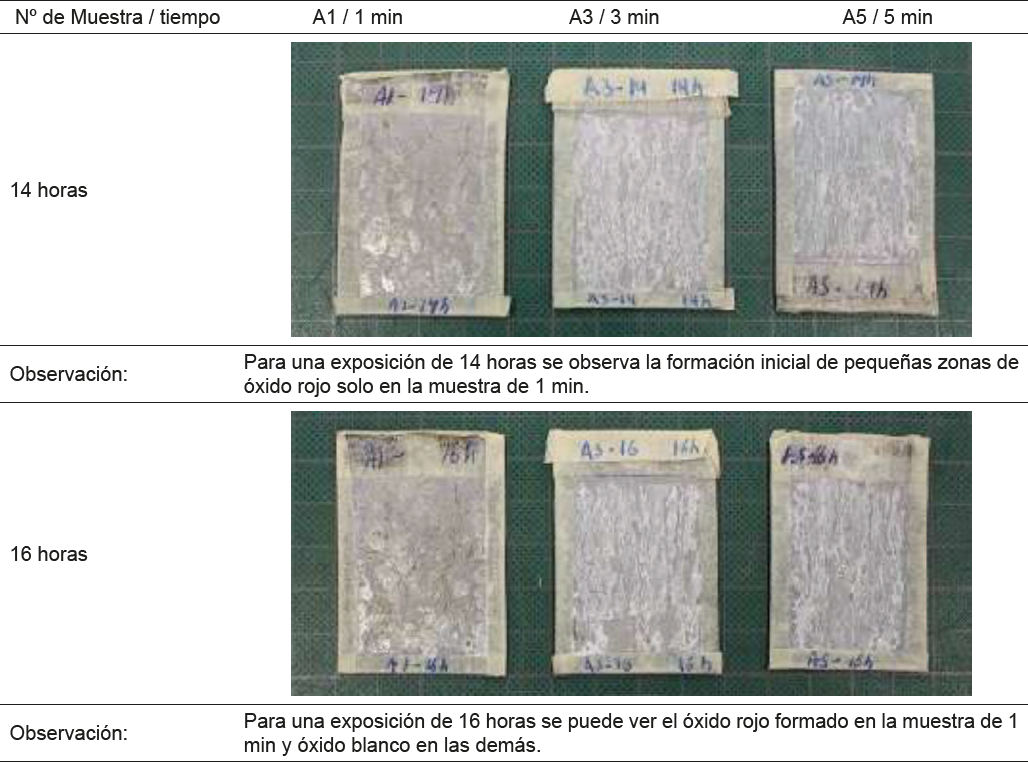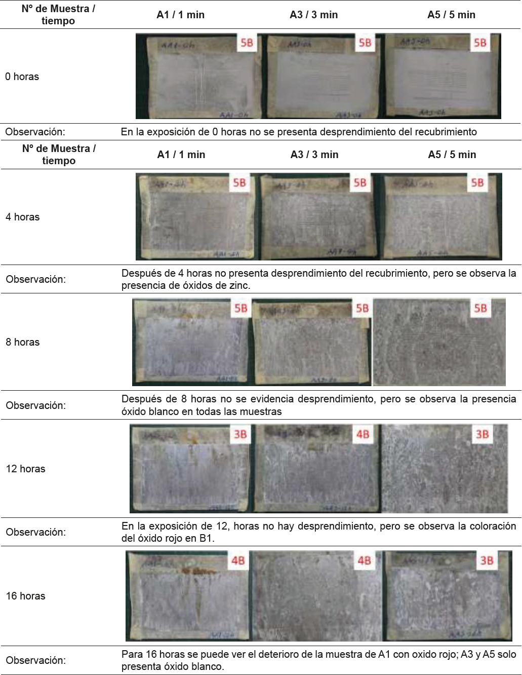 La tabla 3 muestra los resultados obtenidos al someter los recubrimientos obtenidos a tiempos 1,3 y 5 minutos de diferentes muestras electrozincadas.