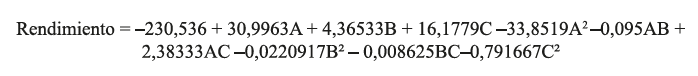 Se utilizó un método de regresión no lineal para ajustar los datos experimentales a un modelo polinomial de segundo orden e identificar los términos relevantes del modelo, obteniéndose la ecuación 1.