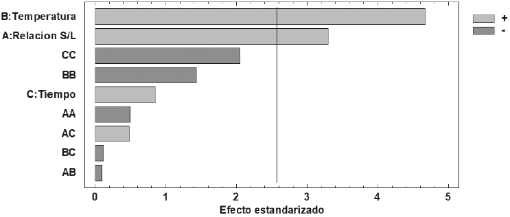 Se analizó el diagrama de Pareto (figura 1), donde se presentan en forma decreciente de importancia, cada uno de los efectos estudiados. En el diagrama de Pareto la longitud de cada barra es proporcional al efecto estandarizado, que es el efecto estimado entre su error estándar. La línea vertical que se presenta es utilizada para juzgar cuales son los efectos estadísticamente significativos. Cualquier barra que se extienda más allá de dicha línea vertical corresponde a efectos que son estadísticamente significativos con un 95% de nivel de confianza.