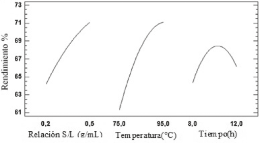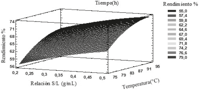 La función conllevó a un gráfico de superficie de respuesta, como se observa en la figura 3, donde, con un tiempo de extracción de 10,4 horas, una relación S/L de 0,499 y una temperatura de 95 ºC se puede obtener un rendimiento óptimo de 73,81% de la reticulación de los taninos.