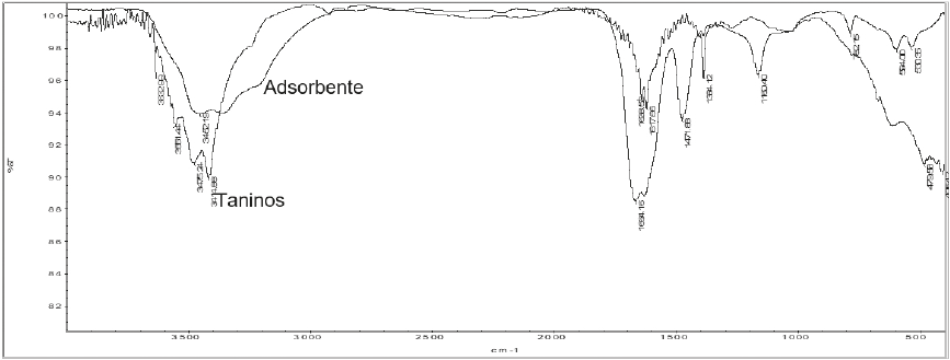 El proceso de reticulación de los taninos extraídos de la corteza, cuando se usa ácido sulfúrico concentrado como agente reticulante conduce a la formación de un material rígido de porosidad y tamaño de partícula adecuadas para los procesos de adsorción [11]. Es por ello que se analizaron los espectros IR de los taninos y una vez realizada la reticulación, cuyos resultados se presentan en la figura 4.