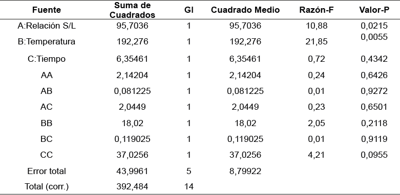 En la tabla 1, se muestran los resultados obtenidos del análisis de varianza (ANOVA), realizado con ayuda del software Statgraphics Centurión XVI. II. El análisis de varianza se llevó a cabo para determinar la significancia estadística de cada efecto comparando su cuadrado medio contra un estimado del error experimental, de esta manera se obtuvieron los valores de los factores significativos para el rendimiento del proceso de reticulación de los taninos de corteza de Pinus patula. Para la optimización de las condiciones operacionales para la reticulación y establecer la significancia estadística de los efectos se utilizó un nivel confianza del 95% (error máximo permisible 5%), por lo tanto, se aceptaron como significativos aquellos efectos o parámetros que tengan un error (valor P), menor que 0,05. Para analizar simultáneamente el efecto de los factores seleccionados, se plantearon las siguientes hipótesis que ayudaran a establecer las condiciones óptimas para la reticulación. Se plantearon dos hipótesis para cada uno de los efectos principales A (Relación S/L), B (Temperatura) y C (Tiempo).