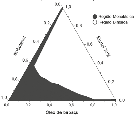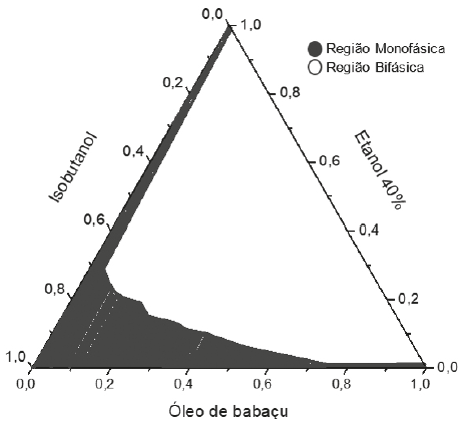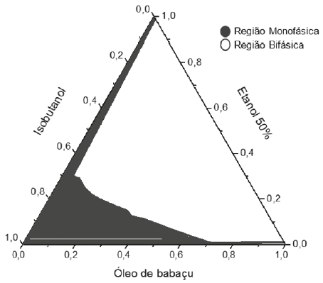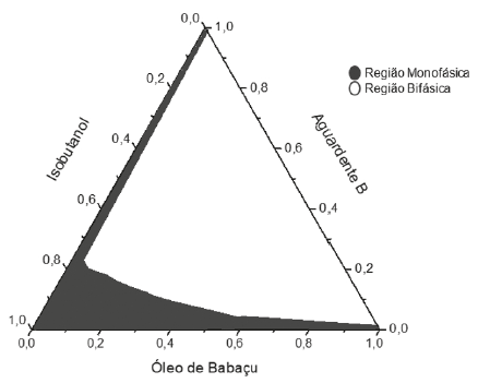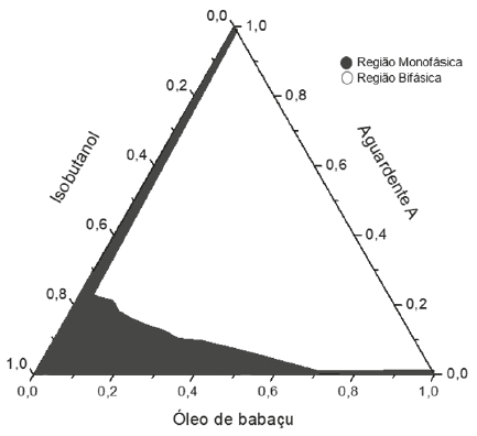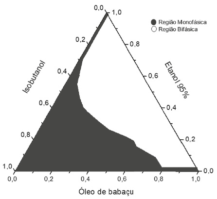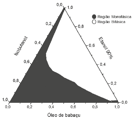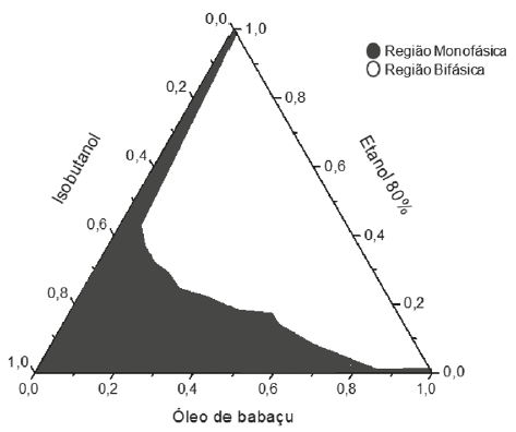O objetivo da construção dos diagramas de fases é obtenção dos pontos críticos onde a solubilização das fases interna e dispersa é máxima. O diagrama de fases descreve em que condição experimental é possível se obter microemulsões e as regiões limites de transição entre emulsões, fases separadas e microemulsões O/A e A/O [11]. A partir da preparação de misturas de dois líquidos pouco miscíveis de composição conhecida, titulados com um tensoativo obtém-se o diagrama de fase ternário, onde a fase oleosa é o óleo de babaçu, a fase aquosa é a solução de etanol ou a aguardente e o tensoativo é o álcool isobutílico. A tabela 3 apresenta o comportamento observado no teste de solubilidade para os componentes: óleo de babaçu/etanol-água/isobutanol e óleo de babaçu/aguardente/isobutanol.