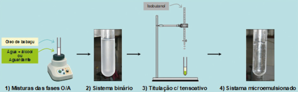 Inicialmente, foi medida a massa do óleo de babaçu e a solução de etanol (40% a 95%) ou aguardente em proporções que variaram entre 10% e 90% para esses constituintes e misturamos até a obtenção de um aspecto turvo para esse sistema heterogêneo. Em seguida, essa mistura foi titulada com o isobutanol até a obtenção de uma mistura com aspecto transparente e homogêneo que corresponde ao sistema microemulsionado. A partir dos volumes gastos foram obtidas as frações em massa destes componentes, utilizando cálculos estequiométricos. As frações foram calculadas a partir das seguintes relações, onde mo = massa da fase oleosa; ma = massa da fase aquosa e mi = massa de isobutanol (equações 1, 2 e 3)