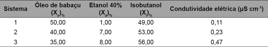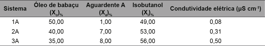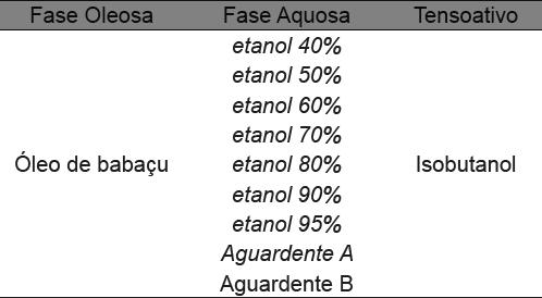 Foram preparados os sistemas microemulsionados utilizando somente a solução de etanol 40% e as aguardentes comerciais A e B como fase aquosa.