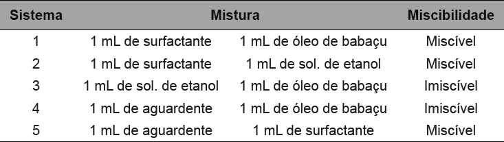 Antes da construção dos diagramas de fases, foi realizado o teste de solubilidade dos componentes utilizados para obter as microemulsões; esses componentes são: óleo de babaçu utilizado como fase oleosa; etanol 40% - 95% e aguardentes utilizadas como fase aquosa e o isobutanol como tensoativo.