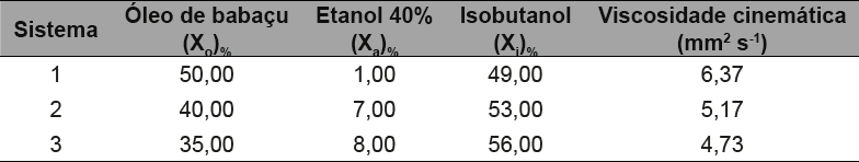 Observa-se nas tabelas 4,5,6 que as microemulsões com menor percentual de fase oleosa (óleo de babaçu) e maior percentual de fase aquosa e surfactante (isobutanol) apresentaram uma viscosidade cinemática menor. Portanto, concluise que à medida que se diminui a proporção do óleo de babaçu e aumenta a proporção do etanol do isobutanol à viscosidade cinemática diminui. Esse resultado indica que o teor de óleo nos sistemas influencia diretamente na viscosidade dos mesmos.